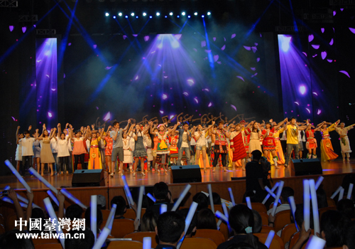 晚會上,滬臺大學生表演了歌舞、朗誦、民樂演奏等精彩紛呈的節(jié)目。其中,臺灣少數(shù)民族營員的舞蹈《慶豐年》、臺灣中國文化大學營員的小品、實踐大學營員的集體舞都受到全場熱烈歡迎。而滬臺大學生同臺表演的壓軸節(jié)目《歌曲串燒》更是掀起了整場晚會的高潮。臺上的主唱同學邊唱邊對臺下?lián)]手,頗有明星風范,而臺下的同學則隨著節(jié)拍揮舞熒光棒,熱切地互動回應,會場氣氛熱烈而溫馨。