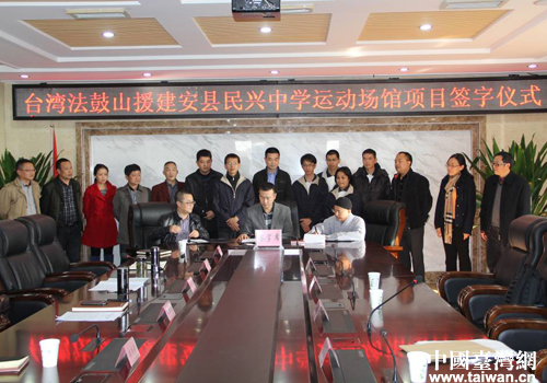 中國臺灣網11月29日安縣消息 日前,臺灣法鼓山慈善基金會與綿陽市安縣人民政府及民興中學正式簽定援建協議,將援建安縣民興中學運動場館項目,持續濃厚與安縣的情緣。法鼓山副住持果品法師,安縣縣委副書記、縣長胡德兵,副縣長、公安局長岳兵以及縣委統戰部、臺辦、教體局、民興中學等部門負責同志出席簽字儀式。
