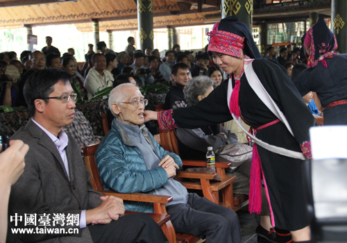 參加表演的黎族少女把“捏耳朵”禮節(jié)送給余光中先生。(中國臺(tái)灣網(wǎng) 李瑞艷 攝)