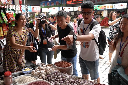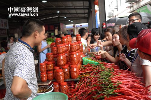 中國臺灣網7月21日成都訊 7月21日,成都市金牛區黃忠菜市場來了一群特殊的客人,他們就是參加“尋麻問辣品四川”川臺學生川菜文化體驗營的20位來自臺灣與四川各大高校的學生。帶著尋找川菜香料的任務,學生們分成小組走進菜市場,根據圖片尋找到相應的香料。
