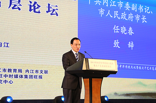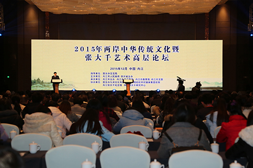 中國臺灣網12月28日內江訊  2015年12月24日至26日, 2015年兩岸中華傳統文化暨張大千藝術高層論壇在四川內江舉辦。四川省政府副秘書長陳越良宣布開幕,四川省臺辦主任周敏謙、內江市市長任曉春和中國國民黨中央評議委員會主席團主席張榮恭等出席開幕式并致辭,內江市委副書記周勇主持開幕式。蘇叔陽、魏明倫、黃光男、鄭愁予等來自海峽兩岸的文人名人、專家學者、臺商代表、青年學生等近200人參加。