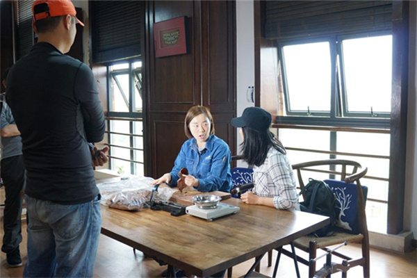 “132”秘制雪茄小組嫡傳弟子李秋月(中)現場演示雪茄卷制