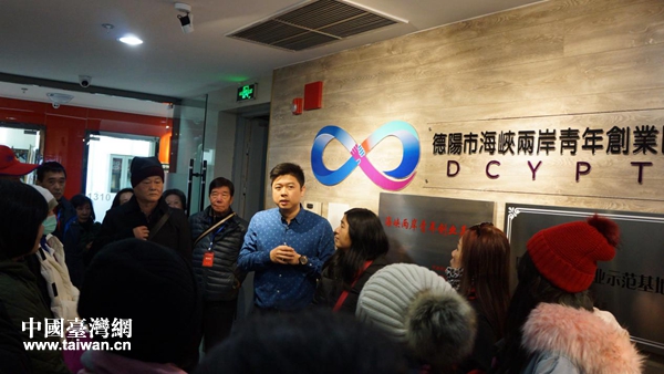 許淵順(中)為到訪德陽(yáng)青創(chuàng)園的臺(tái)灣同胞介紹園區(qū)發(fā)展情況。(圖片來(lái)源:四川省臺(tái)辦)