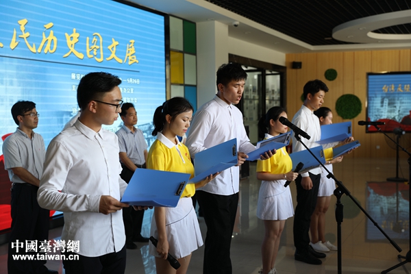 賀州學院的同學還朗誦了從圖文展中選取臺灣作家巫永福的詩詞《祖國》。(圖片來源:廣西賀州市臺辦)
