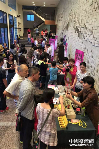 演出開始前,在互動區域,五位首次來到臺灣屏東的大陸“非物質文化遺產”項目傳承人,現場觀眾體驗風箏、毛猴、面人、剪紙、吹糖人等五項中華傳統文化技藝。