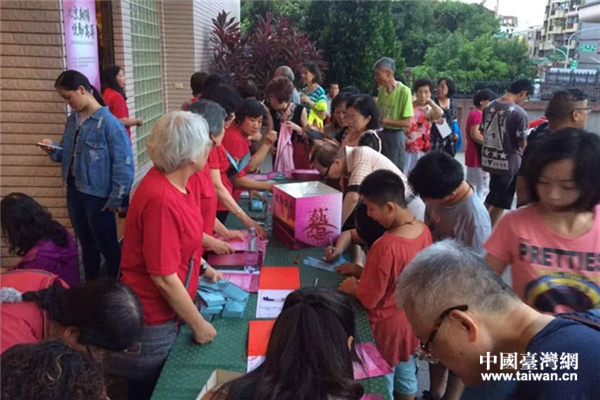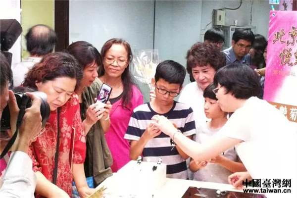 在屏東市屏榮高中禮堂的大門內,五張鋪著綠布的桌案一字排開,五位中華傳統文化技藝傳承人展示著各自的絕活,桌子前面擠滿了來參加“北京朝陽‘悅動屏東’社區文化大舞臺”的觀眾,有的一家老小分開來排隊,盼望著早點輪到自己體驗。
