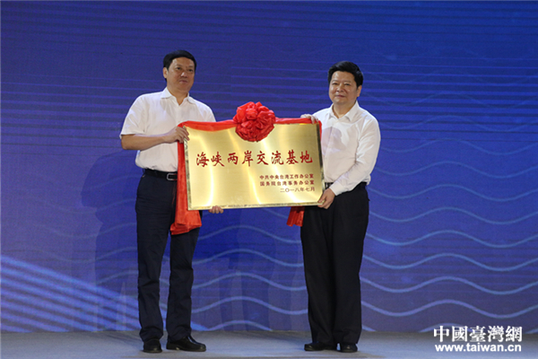 龍明彪向福州市市長尤猛軍頒發(fā)“海峽兩岸交流基地”牌匾。(中國臺灣網(wǎng) 郜利敏 攝)