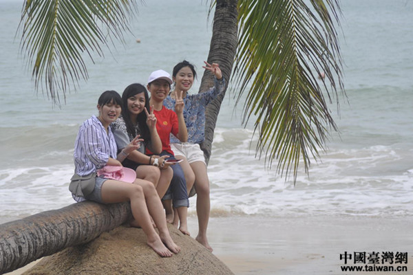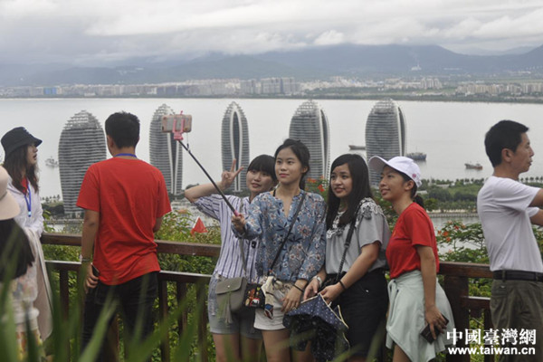 臺灣營員在三亞鹿回頭公園山頂把美麗的三亞灣攝入鏡頭。(圖片來源:海南臺辦)