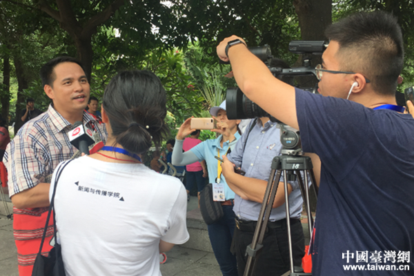 來自臺灣少數民族的青年代表林金龍接受媒體采訪。(圖片來源:廣州市臺聯)