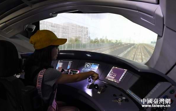 在模擬駕駛艙“客串”高鐵司機。(四川省臺辦 陳治普 攝)