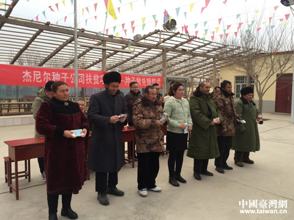 中國臺灣網12月28日訊 24日,新疆生產建設兵團農十四師皮山農場一連召開了一場特殊的儀式——“杰尼爾種子公司扶貧項目——種子款兌現儀式”。活動現場,杰尼爾種子公司新疆片區負責人趙文言將78185元種子款送到一連7戶職工群眾手中。每戶得到了6100元至8600元不等的種子款。