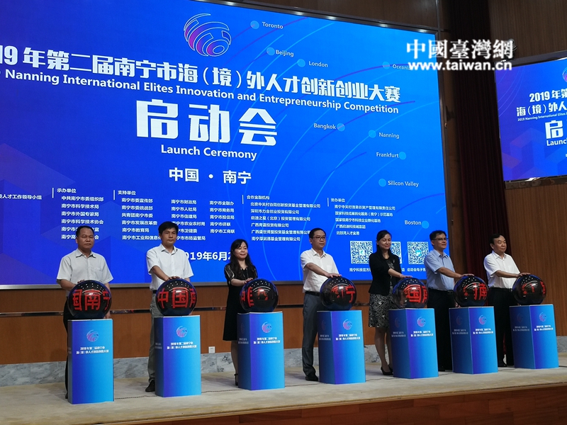 中國臺灣網6月28日南寧訊 6月26日,2019年第二屆南寧市海(境)外人才創新創業大賽在廣西南寧·中關村創新示范基地啟動,廣西科技廳,南寧市委組織部、科技局、科協、外事辦、高新區管委會相關負責人出席,按下啟動球為參賽選手點亮征程。