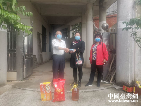 廣西玉林市容縣臺辦主任曾漢萍到臺胞葉國斌蘭花園走訪,送上口罩和生活物資。 (中國臺灣網 發)