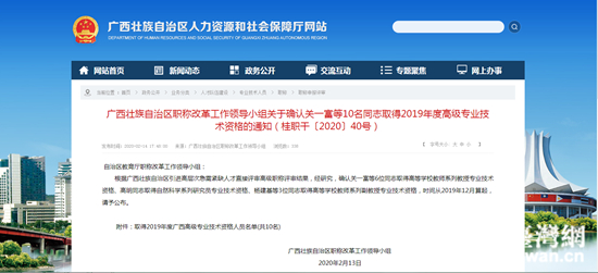 中國臺灣網(wǎng)2月28日訊 據(jù)廣西壯族自治區(qū)人力資源和社會保障廳消息,廣西壯族自治區(qū)職稱改革工作領導小組評審確認10位同志取得2019年廣西高級專業(yè)技術(shù)資格,其中包含4名臺籍教師。
