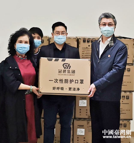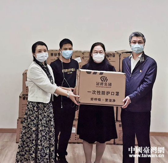 曾衛(wèi)東向伯峰茶業(yè),米樂嘉餐飲兩家臺(tái)企代表贈(zèng)送防護(hù)口罩。 (中國臺(tái)灣網(wǎng) 發(fā))