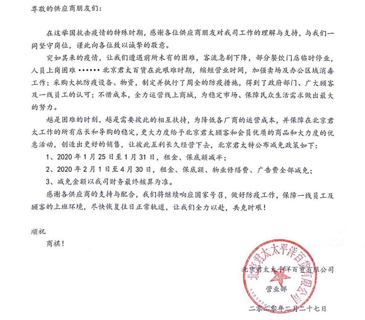 “越是困難的時刻,越是需要彼此的相互扶持。”北京君太百貨聲明,為降低各廠商的運營成本,保障在君太百貨工作的所有店長和導購的穩定,更大力度給予顧客和會員優質的商品,讓彼此互利長久經營下去,公司實施讓人出乎意料的減免措施:2020年1月25日至31日,租金、保底額減半,2月1日至4月30日,租金、保底額、物業修繕費、廣告費全部減免。據測算,此次君太百貨為租戶減免費用超過1億元。
