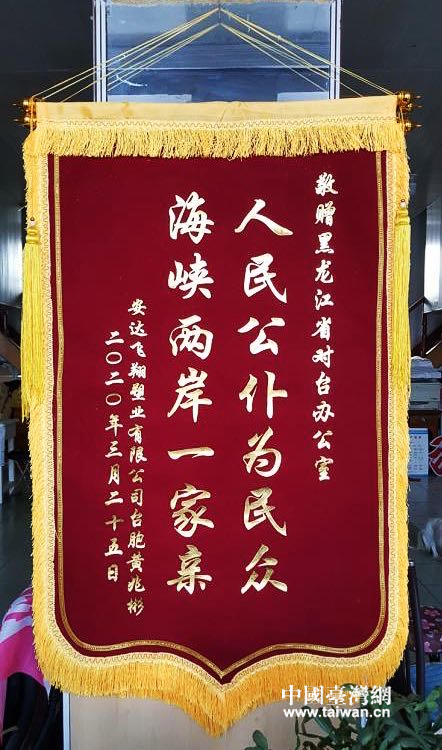 中國臺灣網3月29日訊 3月27日,黑龍江省委臺辦收到安達飛翔塑業有限公司經理臺胞黃兆彬先生送來的寫著“人民公仆為民眾,海峽兩岸一家親”的錦旗。