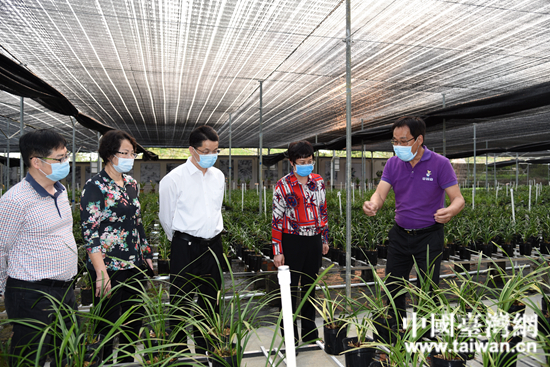李東興在廣西笠震蘭文化旅游有限公司蘭花示范基地了解基地建設及防疫情況。 (中國臺灣網(wǎng) 發(fā))