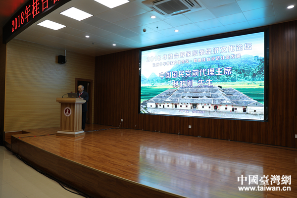 2018年12月,林政則出席桂臺客家宗親經濟文化論壇并致辭。 (中國臺灣網 發)
