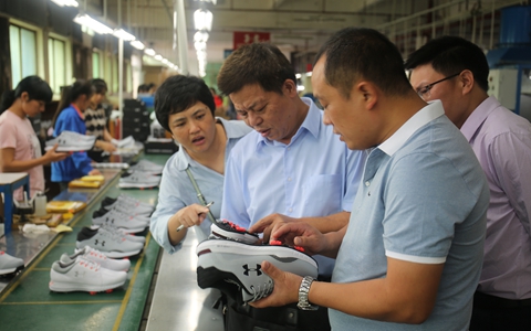 欽州市臺辦考察廣西興萊鞋業(yè)生產(chǎn)線。(廣西欽州市臺辦供圖)