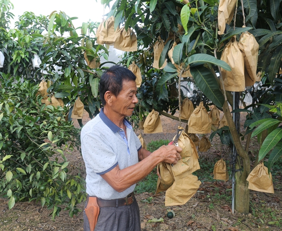 臺企臺果休閑果場負(fù)責(zé)人賴忠治采摘臺芒。(廣西欽州市臺辦供圖)