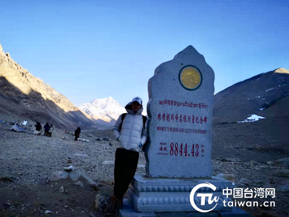 何浩宇與珠穆朗瑪峰合影留念。(中國臺灣網發)
