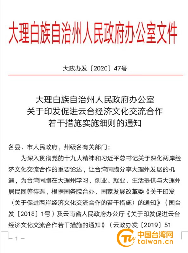 中國臺灣網(wǎng)1月22日訊 為深入貫徹黨的十九大精神和習(xí)近平總書記關(guān)于深化兩岸經(jīng)濟(jì)文化交流合作的重要思想,積極踐行“兩岸一家親”理念,讓臺灣同胞分享云南省大理州發(fā)展機(jī)遇,為臺灣同胞在大理州學(xué)習(xí)、創(chuàng)業(yè)、就業(yè)、生活提供與大理州居民同等待遇,大理州結(jié)合實際,制定出臺了《大理白族自治州人民政府辦公室關(guān)于印發(fā)促進(jìn)云臺經(jīng)濟(jì)文化交流合作若干措施實施細(xì)則的通知》(以下簡稱大理州惠臺“50條措施”)。
