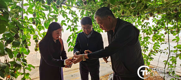 蘇林(中)、胡小麗(左)、王九全(右)參觀百香果種植大棚。(圖片來源廣西崇左市臺辦供圖)