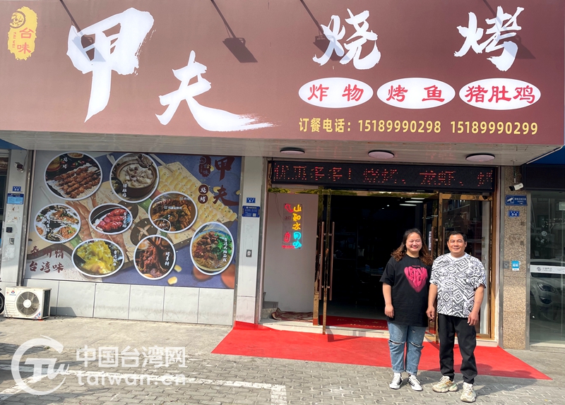 夫妻倆與小吃店合影(圖片來源:泰州市海陵區臺辦)