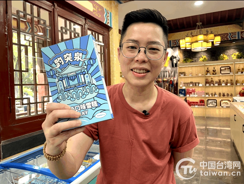 臺青們打卡趵突泉時被這里的一款網紅雪糕吸引。該雪糕外形沿用了國潮風的設計,有趵突泉標志性建筑觀瀾亭和三股噴涌而出的泉眼。升級版的雪糕還有濟南近期走紅的錦鯉“魚墩墩”的形象。“魚墩墩”身上頂著一枚銅錢,這個形象動靜結合、趣味橫生,有錦鯉附體、魚躍龍門的意思。吃完之后,會在雪糕棒上發現有“趵喜”“趵富”“趵一抱”的字樣。據介紹在節假日期間,這種網紅雪糕一天能夠賣出四五百支。