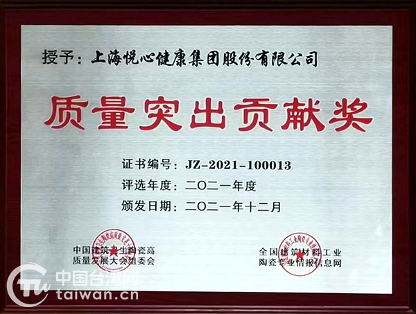中國(guó)臺(tái)灣網(wǎng)10月9日訊 臺(tái)資企業(yè)悅心健康集團(tuán)近日發(fā)布喜報(bào),子公司斯米克(全稱“上海斯米克建筑陶瓷有限公司”)榮獲2021年度“質(zhì)量突出貢獻(xiàn)獎(jiǎng)”。