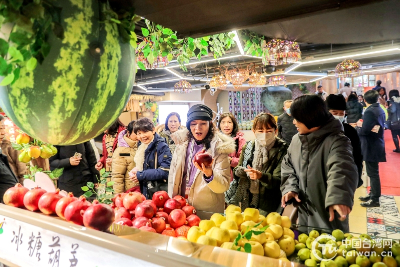 臺(tái)灣商業(yè)總會(huì)女企業(yè)家參訪團(tuán)在大巴扎景區(qū)水果巴扎參觀(新疆臺(tái)辦供圖)
