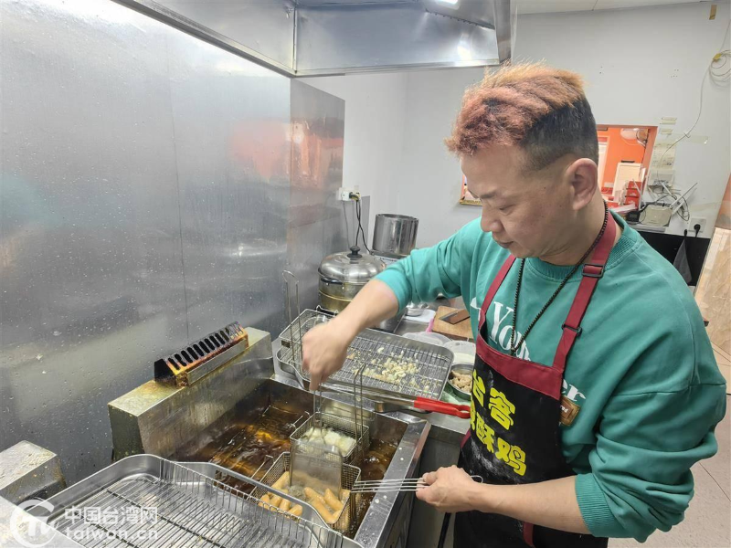 位于江漢區北湖正街的“臺客鹽酥雞”店內,潘佳輝正在專心制作炸品。(中國臺灣網發)