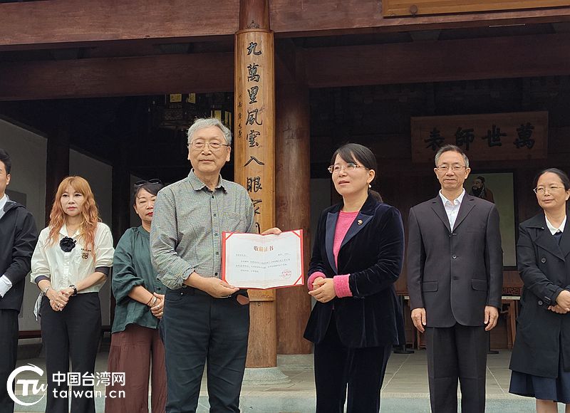 浦江縣檔案館為旅臺(tái)畫(huà)家任墨蓉女士之子洪其祥先生頒發(fā)收藏證書(shū)。(中國(guó)臺(tái)灣網(wǎng)發(fā))
