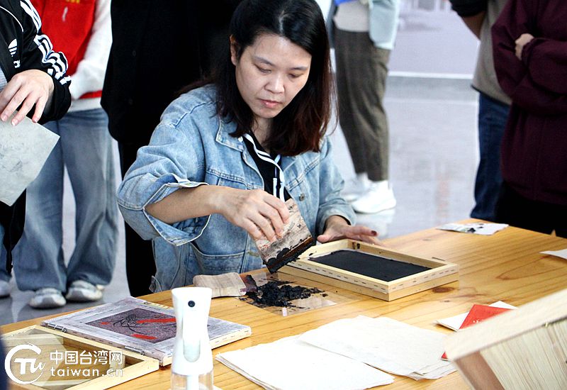 交流團成員親手體驗水墨拓印環(huán)節(jié)。(中國臺灣網(wǎng)發(fā))