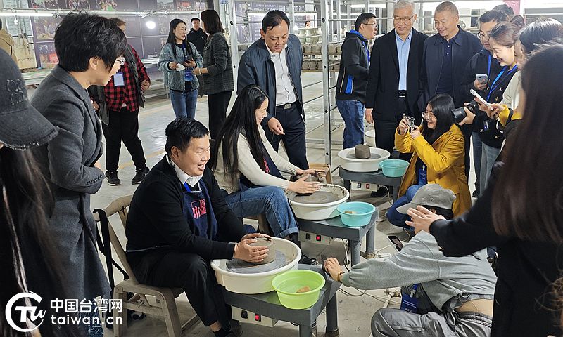 媒體記者們親手體驗汝瓷拉坯、修坯的過程。(中國臺灣網發)