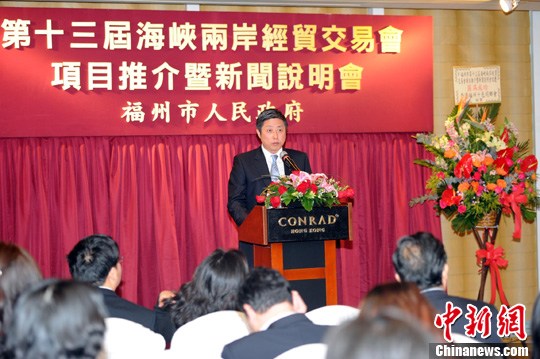 3月18日,作為大陸最早舉辦兩岸經貿展會和對臺經貿政策先行先試的重要窗口、“第13屆海峽兩岸經貿交易會”開幕前,為隆重其事福州市政府在香港舉辦項目推介會,副市長陳為民到會披露福州建設及發(fā)展閩、港、澳、臺經貿合作新態(tài)。中新社發(fā) 鄭祚聲 攝