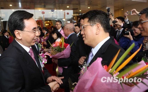 “二00九年廣州市授予榮譽市民大會”十一月二十六日在廣州舉行,大會向二十六位海外僑胞、港澳臺同胞和國際友人授予廣州市榮譽市民稱號,以表彰他們多年來對廣州市經(jīng)濟建設(shè)和社會公益事業(yè)等方面做出的貢獻(xiàn)。這次被授予稱號的二十六位榮譽市民中,香港同胞十人,澳門同胞兩人,臺灣同胞六人,外籍華人兩人,外國友人六人。據(jù)不完全統(tǒng)計,這二十六位榮譽市民多年來在廣州市共投資和引資一百二十九億元人民幣,捐贈和引薦捐資二點五二億人民幣。圖為廣州市委書記朱小丹在東方賓館迎接榮譽市民。中新社發(fā) 羅仰明 攝