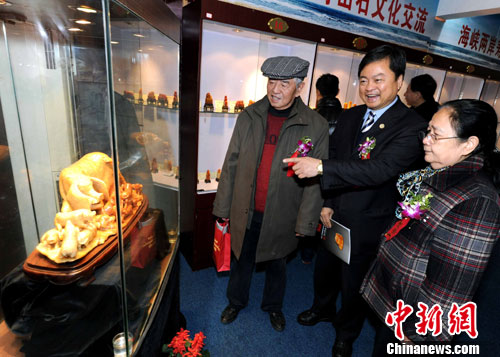 1月26日,來自海峽兩岸的2000名壽山石“石友”聚首福州進行文化交流。當日,由福州海峽兩岸和平統一促進會、臺灣海峽兩岸和平統一促進會等單位聯合主辦的2011海峽兩岸迎新春石友聯誼系列活動在福建藏天園藝術館開幕,為期24天的活動將舉辦“壽山石文化交流懇談會”、“兩岸石友鬧元霄”、“非物質文化傳承人與石友交流”等活動。圖為臺灣“一國兩制”研究協會會長蔡武璋(右二)與福州海峽兩岸交流協會會長李純粹(右一)等嘉賓參加該聯誼活動。