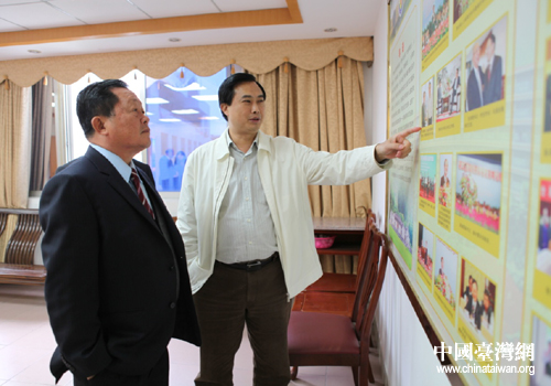 梅州市委臺(tái)辦主任、梅州市海峽兩岸交流基地辦公室主任吳壽康(右)向苗栗縣縣長(zhǎng)劉政鴻介紹梅州市海峽兩岸交流基地的情況。(圖片來源:梅州市委臺(tái)辦)