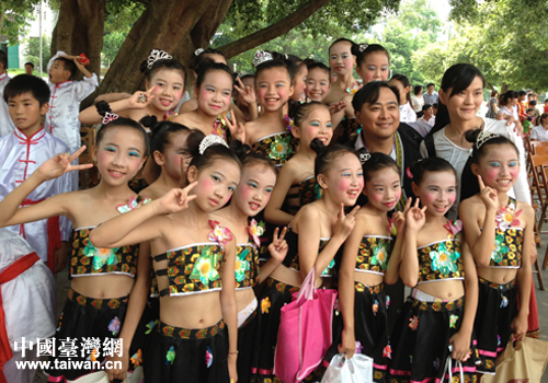 宜州市德勝鎮(zhèn)中心小學(xué)小演員們與花蓮教育團(tuán)體代表合影。(圖片來(lái)源:宜州市臺(tái)辦)
