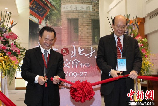 應臺灣大學邀請,校長周其鳳率北京大學134人代表團訪問臺灣,展開北大歷史上規模最大的校際交流活動,并于9日在臺大開展“北京大學日”系列活動。圖為周其鳳(左2)與臺大校長李嗣涔(左1)參觀展覽。中新社發 路梅 攝