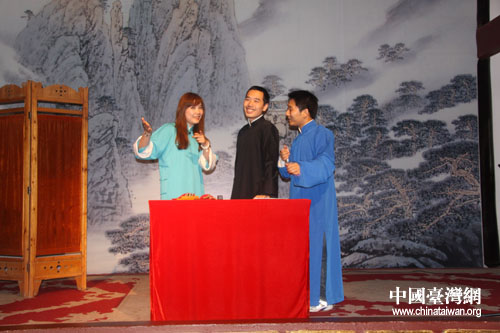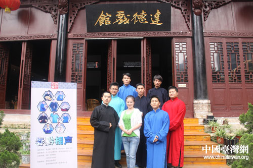 中國臺灣網7月13日貴陽消息 長衫、布鞋、折扇、醒木、手絹、快板,這幾個關鍵詞勾勒的,可不是一板一眼站在臺前說相聲的老夫子,而是幾個“80后”的年輕人——穆伍、洪方舟、陳丹等。每月第一、三周六晚上的8點,在貴陽市達德書院,“春黔相聲工作室”的幾個80后年輕人會身穿長衫,手拿快板,用夾雜著現代詞匯的“傳統相聲”來博得滿場的喝彩。通過網絡了解到貴陽有這樣一群熱愛、傳承中華傳統藝術的年輕人,臺灣東森電視臺《生活接力棒》欄目組便來到這里對他們進行采訪,希望向廣大觀眾傳遞一種精神——夢想與堅持。