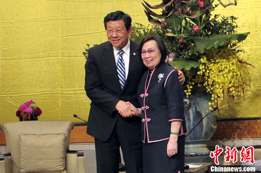 12月2日下午,海協會會長陳德銘在臺北拜會已故臺灣海基會首任董事長辜振甫先生的夫人辜嚴倬云女士。圖為陳德銘與辜嚴倬云女士握手合影。中新社發 葉小剛 攝