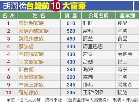 其他前十名臺灣富豪為;富邦集團蔡楊湘薰家族以520億位居第二、頂新集團魏應州家族以460億居于第三,而阿里巴巴集團副主席蔡崇信、宏泰集團林堉璘家族及臺塑集團王文淵家族則同樣以430億資產(chǎn)排名第四,而鴻海集團總裁郭臺銘、國泰金董事長蔡宏圖家族也同以290億排名第五。