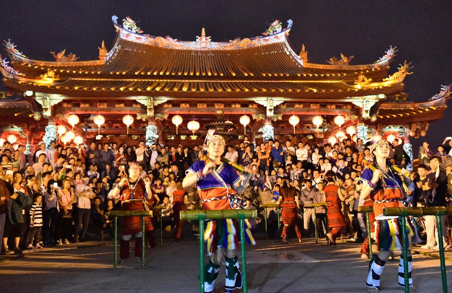 9月23日,昆山臺胞和當地居民在燈會上觀看演出。當日,2015年海峽兩岸昆山中秋燈會在江蘇昆山慧聚寺廣場亮燈,燈會洋溢著濃郁的兩岸風情,吸引了眾多昆山臺胞和當地居民前來觀賞。新華社發(王須中 攝)