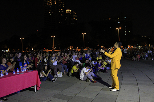 表演在高雄市文化中心廣場舉行。表演開始前,慕名前來觀看表演的人們已經(jīng)把廣場圍了個水泄不通。隨著表演進行,越來越多的人們圍了過來,不僅現(xiàn)場準備的座位座無虛席,連地上都坐滿了人。據(jù)不完全統(tǒng)計,當(dāng)晚到場的觀眾達一千多人。