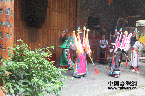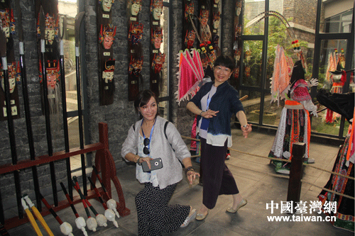 臺(tái)灣藝術(shù)家在地戲模型前擺出舞姿(中國(guó)臺(tái)灣網(wǎng) 蕪?fù)?攝)