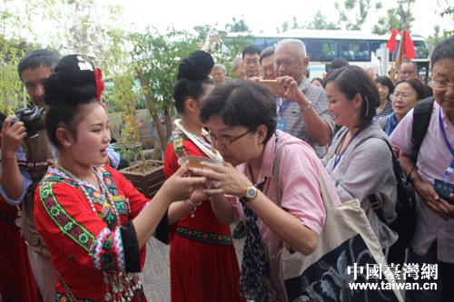 臺(tái)灣嘉賓體驗(yàn)貴州非物質(zhì)文化遺產(chǎn)酸湯魚時(shí),受到苗族姑娘們的特殊歡迎(中國(guó)臺(tái)灣網(wǎng) 蕪?fù)?攝)