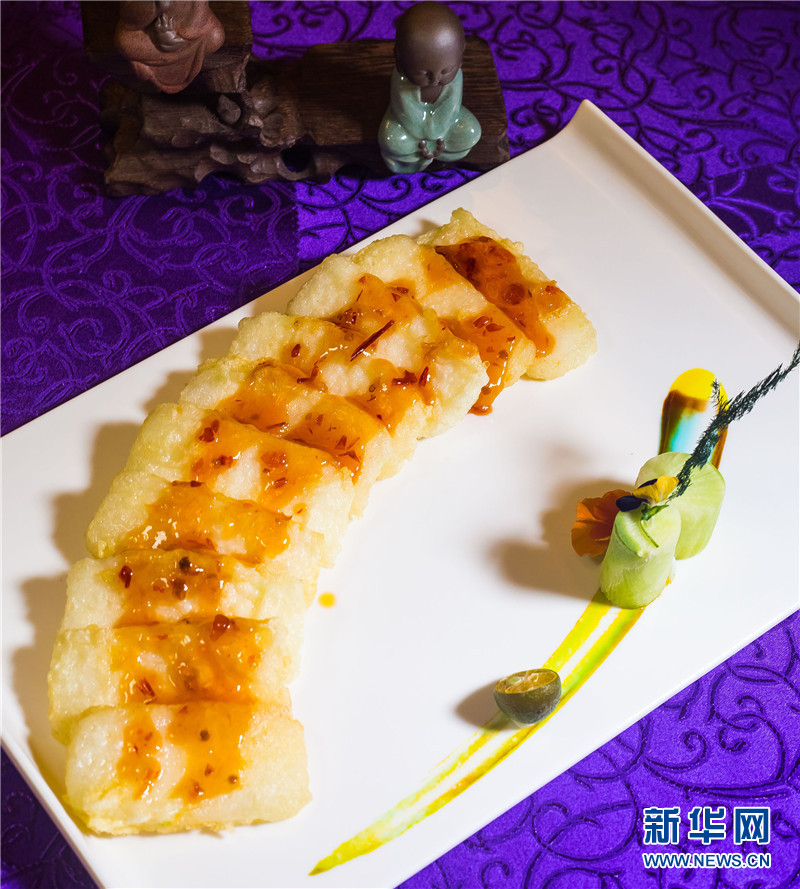 近日,三亞南山新推出用冬瓜制作的名為“泰汁鱈魚(yú)片”素菜。新華網(wǎng)發(fā)(陳文武攝)